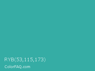 RYB 53,115,173 Color is a normal cyan color and the nearest color is Keppel #3ab09e. Hex code #35ada5 and RGB value is rgb(53,173,165). In RGB color space, this color is composed of 21% red, 68% green, 65% blue, In CMYK color space, this color is composed of 69% cyan, 0% magenta, 5% yellow , 32% black , In HSL color space, this color has a hue angle of 176° , 53% saturation and 44% lightness.