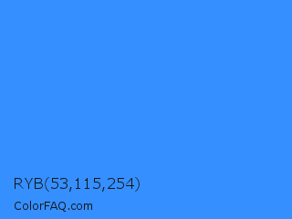 RYB 53,115,254 Color is a normal blue color and the nearest color is Brilliant Azure #3399ff. Hex code #358ffe and RGB value is rgb(53,143,254). In RGB color space, this color is composed of 21% red, 56% green, 100% blue, In CMYK color space, this color is composed of 79% cyan, 44% magenta, 0% yellow , 0% black , In HSL color space, this color has a hue angle of 213° , 99% saturation and 60% lightness.