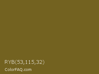 RYB 53,115,32 Color is a dark yellow color and the nearest color is Himalaya #6a5d1b. Hex code #736220 and RGB value is rgb(115,98,32). In RGB color space, this color is composed of 45% red, 38% green, 13% blue, In CMYK color space, this color is composed of 0% cyan, 15% magenta, 72% yellow , 55% black , In HSL color space, this color has a hue angle of 48° , 56% saturation and 29% lightness.