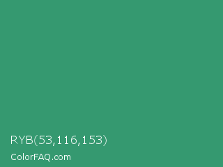 RYB 53,116,153 Color is a normal green color and the nearest color is Illuminating Emerald #319177. Hex code #359970 and RGB value is rgb(53,153,112). In RGB color space, this color is composed of 21% red, 60% green, 44% blue, In CMYK color space, this color is composed of 65% cyan, 0% magenta, 27% yellow , 40% black , In HSL color space, this color has a hue angle of 155° , 49% saturation and 40% lightness.