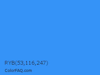RYB 53,116,247 Color is a normal blue color and the nearest color is Brilliant Azure #3399ff. Hex code #3592f7 and RGB value is rgb(53,146,247). In RGB color space, this color is composed of 21% red, 57% green, 97% blue, In CMYK color space, this color is composed of 79% cyan, 41% magenta, 0% yellow , 3% black , In HSL color space, this color has a hue angle of 211° , 92% saturation and 59% lightness.