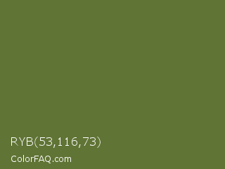 RYB 53,116,73 Color is a normal lime color and the nearest color is Dark Olive Green #556b2f. Hex code #607435 and RGB value is rgb(96,116,53). In RGB color space, this color is composed of 38% red, 45% green, 21% blue, In CMYK color space, this color is composed of 17% cyan, 0% magenta, 54% yellow , 55% black , In HSL color space, this color has a hue angle of 79° , 37% saturation and 33% lightness.