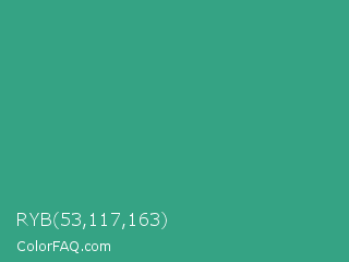 RYB 53,117,163 Color is a normal green color and the nearest color is Zomp #39a78e. Hex code #35a384 and RGB value is rgb(53,163,132). In RGB color space, this color is composed of 21% red, 64% green, 52% blue, In CMYK color space, this color is composed of 67% cyan, 0% magenta, 19% yellow , 36% black , In HSL color space, this color has a hue angle of 163° , 51% saturation and 42% lightness.