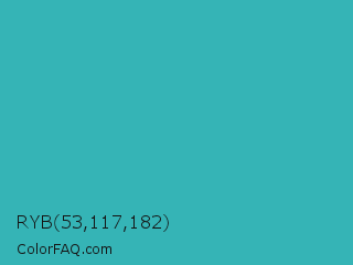 RYB 53,117,182 Color is a normal cyan color and the nearest color is Maximum Blue Green #30bfbf. Hex code #35b4b6 and RGB value is rgb(53,180,182). In RGB color space, this color is composed of 21% red, 71% green, 71% blue, In CMYK color space, this color is composed of 71% cyan, 1% magenta, 0% yellow , 29% black , In HSL color space, this color has a hue angle of 181° , 55% saturation and 46% lightness.