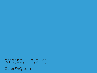 RYB 53,117,214 Color is a normal blue color and the nearest color is Curious Blue #2596d1. Hex code #359fd6 and RGB value is rgb(53,159,214). In RGB color space, this color is composed of 21% red, 62% green, 84% blue, In CMYK color space, this color is composed of 75% cyan, 26% magenta, 0% yellow , 16% black , In HSL color space, this color has a hue angle of 200° , 66% saturation and 52% lightness.