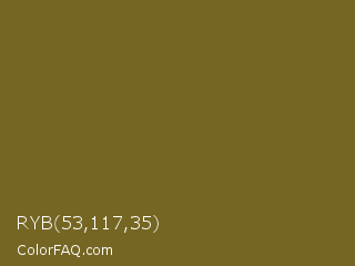 RYB 53,117,35 Color is a dark yellow color and the nearest color is Himalaya #6a5d1b. Hex code #756623 and RGB value is rgb(117,102,35). In RGB color space, this color is composed of 46% red, 40% green, 14% blue, In CMYK color space, this color is composed of 0% cyan, 13% magenta, 70% yellow , 54% black , In HSL color space, this color has a hue angle of 49° , 54% saturation and 30% lightness.