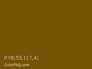 RYB 53,117,4 Color is a dark orange color and the nearest color is Antique Bronze #704a07. Hex code #755304 and RGB value is rgb(117,83,4). In RGB color space, this color is composed of 46% red, 33% green, 2% blue, In CMYK color space, this color is composed of 0% cyan, 29% magenta, 97% yellow , 54% black , In HSL color space, this color has a hue angle of 42° , 93% saturation and 24% lightness.