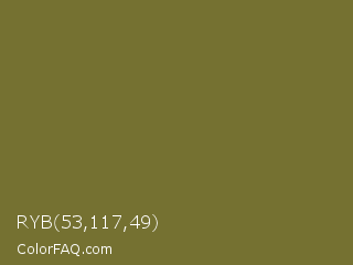 RYB 53,117,49 Color is a normal yellow color and the nearest color is Pesto #7c7631. Hex code #757131 and RGB value is rgb(117,113,49). In RGB color space, this color is composed of 46% red, 44% green, 19% blue, In CMYK color space, this color is composed of 0% cyan, 3% magenta, 58% yellow , 54% black , In HSL color space, this color has a hue angle of 56° , 41% saturation and 33% lightness.