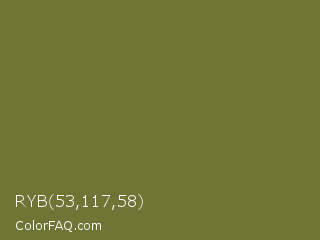 RYB 53,117,58 Color is a normal yellow color and the nearest color is Pesto #7c7631. Hex code #707535 and RGB value is rgb(112,117,53). In RGB color space, this color is composed of 44% red, 46% green, 21% blue, In CMYK color space, this color is composed of 4% cyan, 0% magenta, 55% yellow , 54% black , In HSL color space, this color has a hue angle of 65° , 38% saturation and 33% lightness.