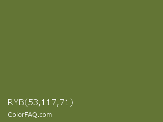 RYB 53,117,71 Color is a normal lime color and the nearest color is Dark Olive Green #556b2f. Hex code #637535 and RGB value is rgb(99,117,53). In RGB color space, this color is composed of 39% red, 46% green, 21% blue, In CMYK color space, this color is composed of 15% cyan, 0% magenta, 55% yellow , 54% black , In HSL color space, this color has a hue angle of 77° , 38% saturation and 33% lightness.