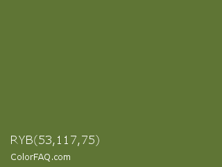 RYB 53,117,75 Color is a normal green color and the nearest color is Dark Olive Green #556b2f. Hex code #5f7535 and RGB value is rgb(95,117,53). In RGB color space, this color is composed of 37% red, 46% green, 21% blue, In CMYK color space, this color is composed of 19% cyan, 0% magenta, 55% yellow , 54% black , In HSL color space, this color has a hue angle of 81° , 38% saturation and 33% lightness.