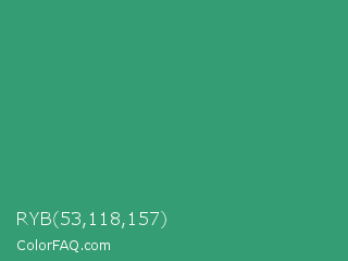 RYB 53,118,157 Color is a normal green color and the nearest color is Illuminating Emerald #319177. Hex code #359d73 and RGB value is rgb(53,157,115). In RGB color space, this color is composed of 21% red, 62% green, 45% blue, In CMYK color space, this color is composed of 66% cyan, 0% magenta, 27% yellow , 38% black , In HSL color space, this color has a hue angle of 156° , 50% saturation and 41% lightness.