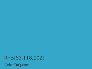 RYB 53,118,202 Color is a normal blue color and the nearest color is Pelorous #3eabbf. Hex code #35a8ca and RGB value is rgb(53,168,202). In RGB color space, this color is composed of 21% red, 66% green, 79% blue, In CMYK color space, this color is composed of 74% cyan, 17% magenta, 0% yellow , 21% black , In HSL color space, this color has a hue angle of 194° , 58% saturation and 50% lightness.