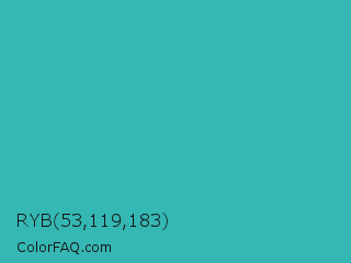 RYB 53,119,183 Color is a normal cyan color and the nearest color is Maximum Blue Green #30bfbf. Hex code #35b7b3 and RGB value is rgb(53,183,179). In RGB color space, this color is composed of 21% red, 72% green, 70% blue, In CMYK color space, this color is composed of 71% cyan, 0% magenta, 2% yellow , 28% black , In HSL color space, this color has a hue angle of 178° , 55% saturation and 46% lightness.