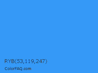 RYB 53,119,247 Color is a normal blue color and the nearest color is Brilliant Azure #3399ff. Hex code #3599f7 and RGB value is rgb(53,153,247). In RGB color space, this color is composed of 21% red, 60% green, 97% blue, In CMYK color space, this color is composed of 79% cyan, 38% magenta, 0% yellow , 3% black , In HSL color space, this color has a hue angle of 209° , 92% saturation and 59% lightness.