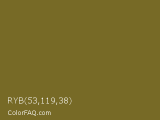 RYB 53,119,38 Color is a normal yellow color and the nearest color is Crete #737829. Hex code #776a26 and RGB value is rgb(119,106,38). In RGB color space, this color is composed of 47% red, 42% green, 15% blue, In CMYK color space, this color is composed of 0% cyan, 11% magenta, 68% yellow , 53% black , In HSL color space, this color has a hue angle of 50° , 52% saturation and 31% lightness.