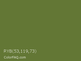 RYB 53,119,73 Color is a normal lime color and the nearest color is Dingley #5d7747. Hex code #637735 and RGB value is rgb(99,119,53). In RGB color space, this color is composed of 39% red, 47% green, 21% blue, In CMYK color space, this color is composed of 17% cyan, 0% magenta, 55% yellow , 53% black , In HSL color space, this color has a hue angle of 78° , 38% saturation and 34% lightness.