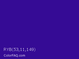 RYB 53,11,149 Color is a normal indigo color and the nearest color is Blue Gem #2c0e8c. Hex code #350b95 and RGB value is rgb(53,11,149). In RGB color space, this color is composed of 21% red, 4% green, 58% blue, In CMYK color space, this color is composed of 64% cyan, 93% magenta, 0% yellow , 42% black , In HSL color space, this color has a hue angle of 258° , 86% saturation and 31% lightness.