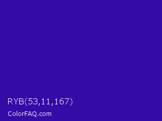 RYB 53,11,167 Color is a normal indigo color and the nearest color is Blue Gem #2c0e8c. Hex code #350ba7 and RGB value is rgb(53,11,167). In RGB color space, this color is composed of 21% red, 4% green, 65% blue, In CMYK color space, this color is composed of 68% cyan, 93% magenta, 0% yellow , 35% black , In HSL color space, this color has a hue angle of 256° , 88% saturation and 35% lightness.