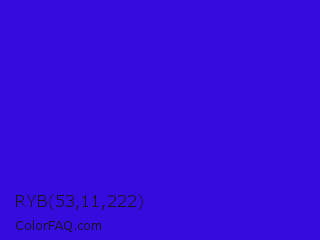 RYB 53,11,222 Color is a normal indigo color and the nearest color is Interdimensional Blue #360ccc. Hex code #350bde and RGB value is rgb(53,11,222). In RGB color space, this color is composed of 21% red, 4% green, 87% blue, In CMYK color space, this color is composed of 76% cyan, 95% magenta, 0% yellow , 13% black , In HSL color space, this color has a hue angle of 252° , 91% saturation and 46% lightness.