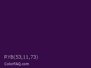 RYB 53,11,73 Color is a very dark purple color and the nearest color is Valentino #350e42. Hex code #350b49 and RGB value is rgb(53,11,73). In RGB color space, this color is composed of 21% red, 4% green, 29% blue, In CMYK color space, this color is composed of 27% cyan, 85% magenta, 0% yellow , 71% black , In HSL color space, this color has a hue angle of 281° , 74% saturation and 16% lightness.