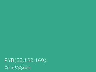 RYB 53,120,169 Color is a normal cyan color and the nearest color is Zomp #39a78e. Hex code #35a98a and RGB value is rgb(53,169,138). In RGB color space, this color is composed of 21% red, 66% green, 54% blue, In CMYK color space, this color is composed of 69% cyan, 0% magenta, 18% yellow , 34% black , In HSL color space, this color has a hue angle of 164° , 52% saturation and 44% lightness.