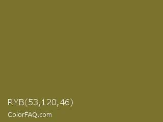 RYB 53,120,46 Color is a normal yellow color and the nearest color is Pesto #7c7631. Hex code #78722e and RGB value is rgb(120,114,46). In RGB color space, this color is composed of 47% red, 45% green, 18% blue, In CMYK color space, this color is composed of 0% cyan, 5% magenta, 62% yellow , 53% black , In HSL color space, this color has a hue angle of 55° , 45% saturation and 33% lightness.