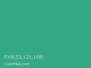 RYB 53,121,168 Color is a normal green color and the nearest color is Zomp #39a78e. Hex code #35a884 and RGB value is rgb(53,168,132). In RGB color space, this color is composed of 21% red, 66% green, 52% blue, In CMYK color space, this color is composed of 68% cyan, 0% magenta, 21% yellow , 34% black , In HSL color space, this color has a hue angle of 161° , 52% saturation and 43% lightness.