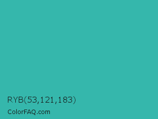RYB 53,121,183 Color is a normal cyan color and the nearest color is Puerto Rico #3fc1aa. Hex code #35b7ac and RGB value is rgb(53,183,172). In RGB color space, this color is composed of 21% red, 72% green, 67% blue, In CMYK color space, this color is composed of 71% cyan, 0% magenta, 6% yellow , 28% black , In HSL color space, this color has a hue angle of 175° , 55% saturation and 46% lightness.