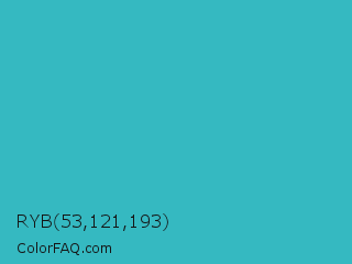 RYB 53,121,193 Color is a normal cyan color and the nearest color is Maximum Blue Green #30bfbf. Hex code #35b9c1 and RGB value is rgb(53,185,193). In RGB color space, this color is composed of 21% red, 73% green, 76% blue, In CMYK color space, this color is composed of 73% cyan, 4% magenta, 0% yellow , 24% black , In HSL color space, this color has a hue angle of 183° , 57% saturation and 48% lightness.