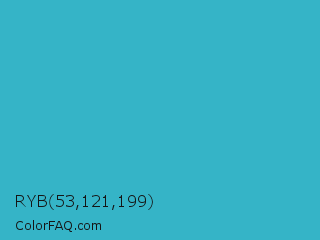 RYB 53,121,199 Color is a normal cyan color and the nearest color is Maximum Blue Green #30bfbf. Hex code #35b4c7 and RGB value is rgb(53,180,199). In RGB color space, this color is composed of 21% red, 71% green, 78% blue, In CMYK color space, this color is composed of 73% cyan, 10% magenta, 0% yellow , 22% black , In HSL color space, this color has a hue angle of 188° , 58% saturation and 49% lightness.