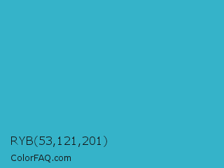 RYB 53,121,201 Color is a normal cyan color and the nearest color is Pelorous #3eabbf. Hex code #35b3c9 and RGB value is rgb(53,179,201). In RGB color space, this color is composed of 21% red, 70% green, 79% blue, In CMYK color space, this color is composed of 74% cyan, 11% magenta, 0% yellow , 21% black , In HSL color space, this color has a hue angle of 189° , 58% saturation and 50% lightness.