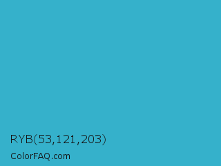 RYB 53,121,203 Color is a normal cyan color and the nearest color is Pelorous #3eabbf. Hex code #35b1cb and RGB value is rgb(53,177,203). In RGB color space, this color is composed of 21% red, 69% green, 80% blue, In CMYK color space, this color is composed of 74% cyan, 13% magenta, 0% yellow , 20% black , In HSL color space, this color has a hue angle of 190° , 59% saturation and 50% lightness.