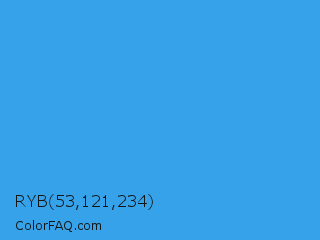 RYB 53,121,234 Color is a normal blue color and the nearest color is Button Blue #24a0ed. Hex code #35a2ea and RGB value is rgb(53,162,234). In RGB color space, this color is composed of 21% red, 64% green, 92% blue, In CMYK color space, this color is composed of 77% cyan, 31% magenta, 0% yellow , 8% black , In HSL color space, this color has a hue angle of 204° , 81% saturation and 56% lightness.