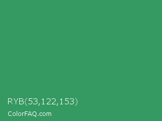 RYB 53,122,153 Color is a normal green color and the nearest color is Chateau Green #40a860. Hex code #359962 and RGB value is rgb(53,153,98). In RGB color space, this color is composed of 21% red, 60% green, 38% blue, In CMYK color space, this color is composed of 65% cyan, 0% magenta, 36% yellow , 40% black , In HSL color space, this color has a hue angle of 147° , 49% saturation and 40% lightness.
