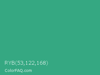 RYB 53,122,168 Color is a normal green color and the nearest color is Zomp #39a78e. Hex code #35a882 and RGB value is rgb(53,168,130). In RGB color space, this color is composed of 21% red, 66% green, 51% blue, In CMYK color space, this color is composed of 68% cyan, 0% magenta, 23% yellow , 34% black , In HSL color space, this color has a hue angle of 160° , 52% saturation and 43% lightness.