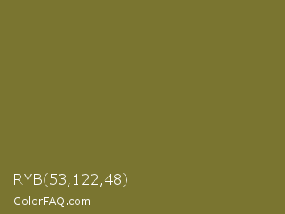 RYB 53,122,48 Color is a normal yellow color and the nearest color is Pesto #7c7631. Hex code #7a7530 and RGB value is rgb(122,117,48). In RGB color space, this color is composed of 48% red, 46% green, 19% blue, In CMYK color space, this color is composed of 0% cyan, 4% magenta, 61% yellow , 52% black , In HSL color space, this color has a hue angle of 56° , 44% saturation and 33% lightness.