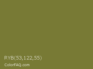 RYB 53,122,55 Color is a normal yellow color and the nearest color is Pesto #7c7631. Hex code #787a35 and RGB value is rgb(120,122,53). In RGB color space, this color is composed of 47% red, 48% green, 21% blue, In CMYK color space, this color is composed of 2% cyan, 0% magenta, 57% yellow , 52% black , In HSL color space, this color has a hue angle of 62° , 39% saturation and 34% lightness.