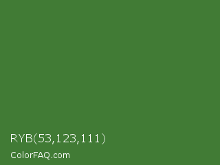 RYB 53,123,111 Color is a normal green color and the nearest color is Sap Green #507d2a. Hex code #417b35 and RGB value is rgb(65,123,53). In RGB color space, this color is composed of 25% red, 48% green, 21% blue, In CMYK color space, this color is composed of 47% cyan, 0% magenta, 57% yellow , 52% black , In HSL color space, this color has a hue angle of 110° , 40% saturation and 35% lightness.