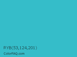 RYB 53,124,201 Color is a normal cyan color and the nearest color is Maximum Blue Green #30bfbf. Hex code #35bdc9 and RGB value is rgb(53,189,201). In RGB color space, this color is composed of 21% red, 74% green, 79% blue, In CMYK color space, this color is composed of 74% cyan, 6% magenta, 0% yellow , 21% black , In HSL color space, this color has a hue angle of 185° , 58% saturation and 50% lightness.