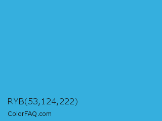 RYB 53,124,222 Color is a normal blue color and the nearest color is Picton Blue #45b1e8. Hex code #35afde and RGB value is rgb(53,175,222). In RGB color space, this color is composed of 21% red, 69% green, 87% blue, In CMYK color space, this color is composed of 76% cyan, 21% magenta, 0% yellow , 13% black , In HSL color space, this color has a hue angle of 197° , 72% saturation and 54% lightness.