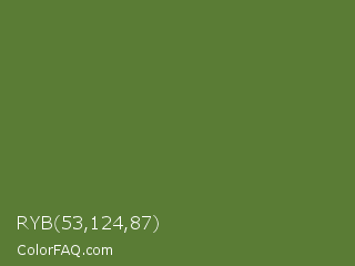 RYB 53,124,87 Color is a normal green color and the nearest color is Sap Green #507d2a. Hex code #5a7c35 and RGB value is rgb(90,124,53). In RGB color space, this color is composed of 35% red, 49% green, 21% blue, In CMYK color space, this color is composed of 27% cyan, 0% magenta, 57% yellow , 51% black , In HSL color space, this color has a hue angle of 89° , 40% saturation and 35% lightness.
