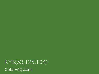 RYB 53,125,104 Color is a normal green color and the nearest color is Sap Green #507d2a. Hex code #4a7d35 and RGB value is rgb(74,125,53). In RGB color space, this color is composed of 29% red, 49% green, 21% blue, In CMYK color space, this color is composed of 41% cyan, 0% magenta, 58% yellow , 51% black , In HSL color space, this color has a hue angle of 103° , 40% saturation and 35% lightness.