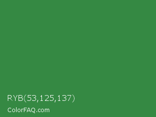 RYB 53,125,137 Color is a normal green color and the nearest color is Goblin #3d7d52. Hex code #358943 and RGB value is rgb(53,137,67). In RGB color space, this color is composed of 21% red, 54% green, 26% blue, In CMYK color space, this color is composed of 61% cyan, 0% magenta, 51% yellow , 46% black , In HSL color space, this color has a hue angle of 130° , 44% saturation and 37% lightness.