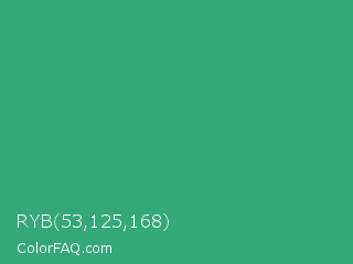 RYB 53,125,168 Color is a normal green color and the nearest color is Ocean Green #41aa78. Hex code #35a87a and RGB value is rgb(53,168,122). In RGB color space, this color is composed of 21% red, 66% green, 48% blue, In CMYK color space, this color is composed of 68% cyan, 0% magenta, 27% yellow , 34% black , In HSL color space, this color has a hue angle of 156° , 52% saturation and 43% lightness.