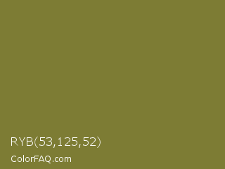 RYB 53,125,52 Color is a normal yellow color and the nearest color is Pesto #7c7631. Hex code #7d7c34 and RGB value is rgb(125,124,52). In RGB color space, this color is composed of 49% red, 49% green, 20% blue, In CMYK color space, this color is composed of 0% cyan, 1% magenta, 58% yellow , 51% black , In HSL color space, this color has a hue angle of 59° , 41% saturation and 35% lightness.