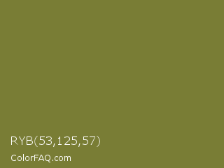 RYB 53,125,57 Color is a normal yellow color and the nearest color is Pesto #7c7631. Hex code #797d35 and RGB value is rgb(121,125,53). In RGB color space, this color is composed of 47% red, 49% green, 21% blue, In CMYK color space, this color is composed of 3% cyan, 0% magenta, 58% yellow , 51% black , In HSL color space, this color has a hue angle of 63° , 40% saturation and 35% lightness.