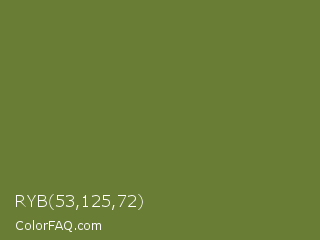 RYB 53,125,72 Color is a normal lime color and the nearest color is Crete #737829. Hex code #6a7d35 and RGB value is rgb(106,125,53). In RGB color space, this color is composed of 42% red, 49% green, 21% blue, In CMYK color space, this color is composed of 15% cyan, 0% magenta, 58% yellow , 51% black , In HSL color space, this color has a hue angle of 76° , 40% saturation and 35% lightness.