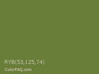 RYB 53,125,74 Color is a normal lime color and the nearest color is Crete #737829. Hex code #687d35 and RGB value is rgb(104,125,53). In RGB color space, this color is composed of 41% red, 49% green, 21% blue, In CMYK color space, this color is composed of 17% cyan, 0% magenta, 58% yellow , 51% black , In HSL color space, this color has a hue angle of 78° , 40% saturation and 35% lightness.