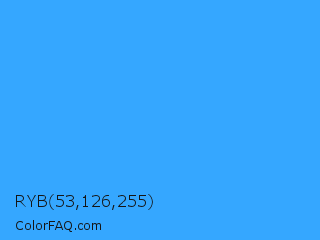 RYB 53,126,255 Color is a normal blue color and the nearest color is Brilliant Azure #3399ff. Hex code #35a7ff and RGB value is rgb(53,167,255). In RGB color space, this color is composed of 21% red, 65% green, 100% blue, In CMYK color space, this color is composed of 79% cyan, 35% magenta, 0% yellow , 0% black , In HSL color space, this color has a hue angle of 206° , 100% saturation and 60% lightness.